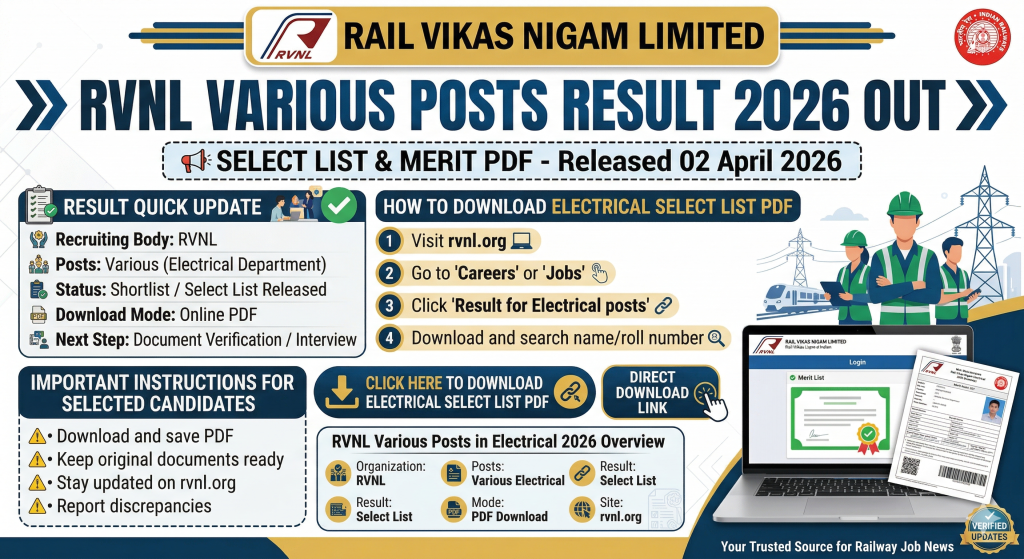 RVNL Various Posts Result 2026 Rail Vikas Nigam Limited – Electrical Department Select List Out | April 02, 2026 Are